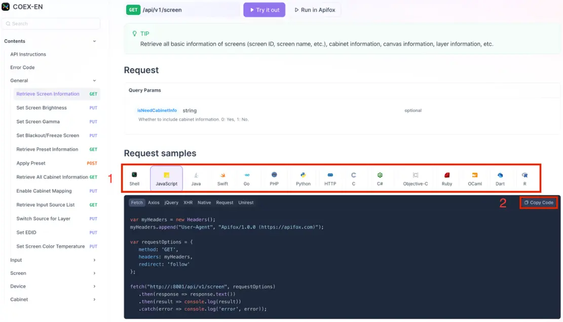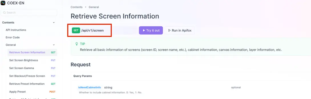 COEX API webpage: Retrieve Screen Information - COEX-EN (novastar.tech)