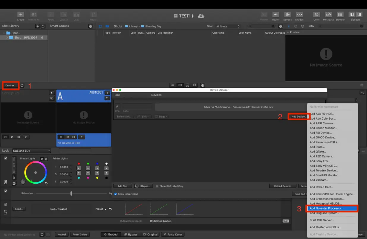 In Livegrade Studio, click the button in order 1, 2, and 3. The window to add a device will appear.