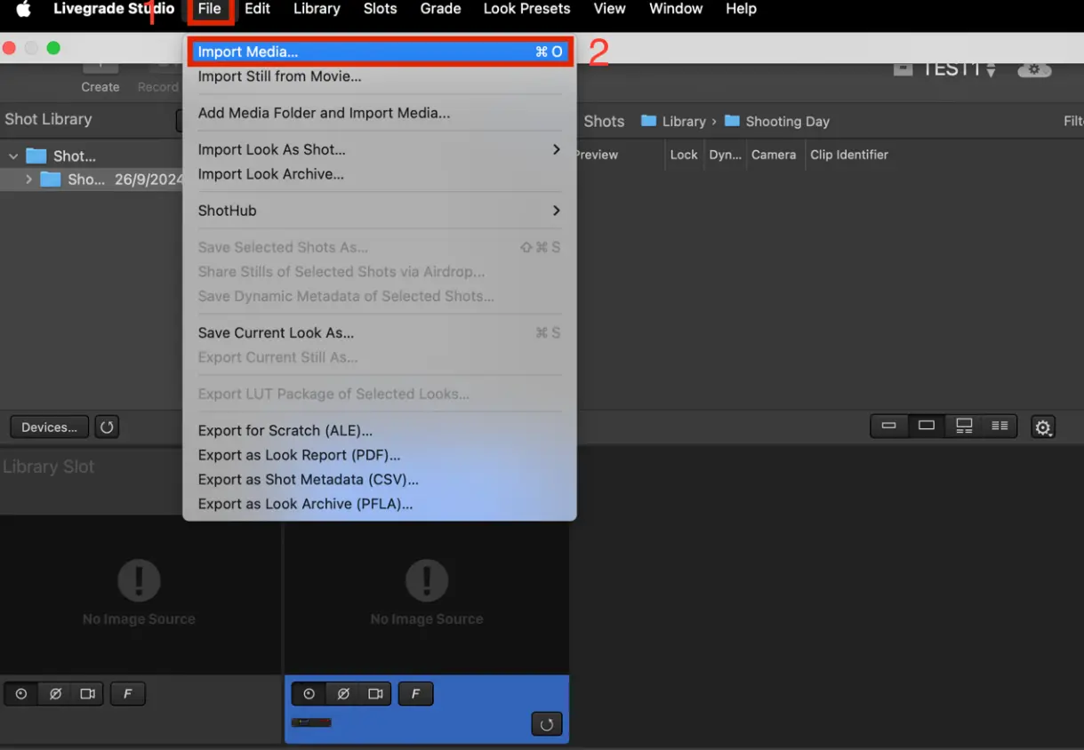 Click on File at the top and select Import Media... to select the source file you want to use as a color grading preview from the local area.