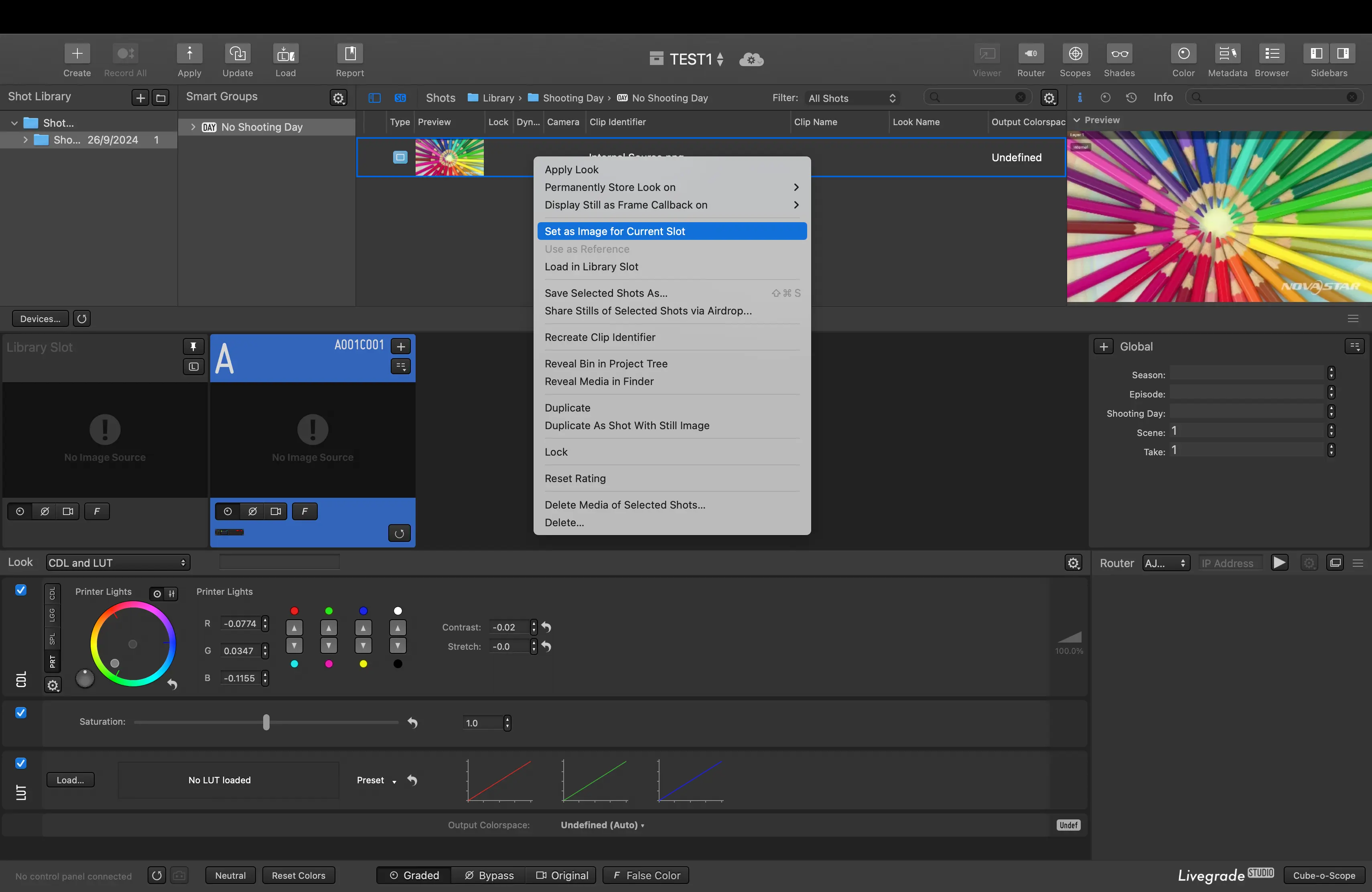 Right-click on the media you just imported in the Livegrade interface and select Set as Image for Current Slot to bring up a preview window where you can observe the color grading in real-time.