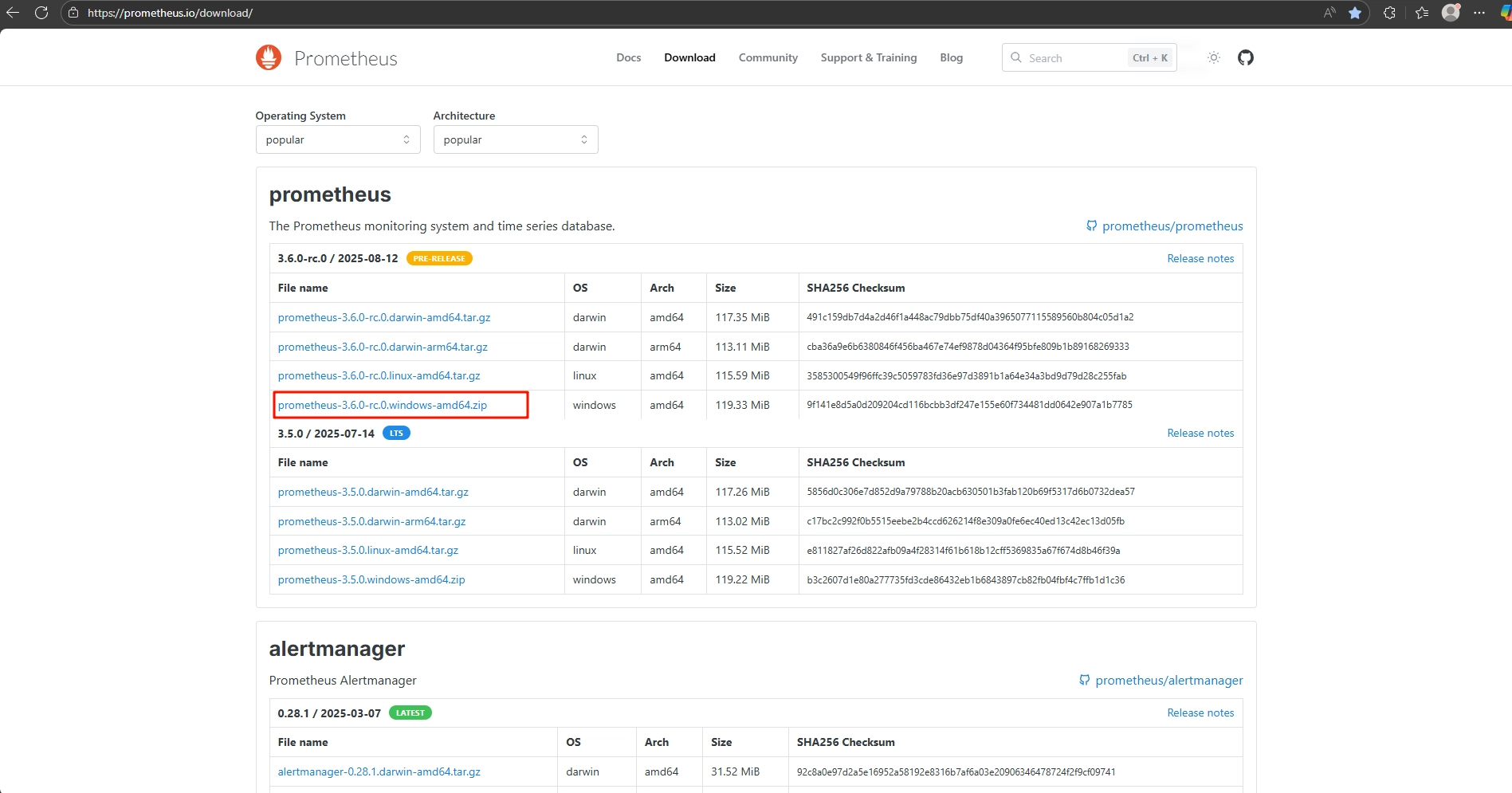 Download and install Prometheus, selecting the correct installation package based on your computer's operating system.