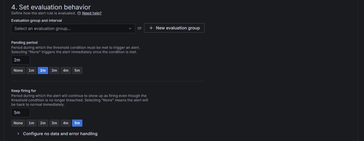 Set evaluation behavior: Configure the frequency of checks. For example, the settings below indicate checking every 2 minutes whether the alert condition is met. The alert will be officially triggered and sent to the configured notification channels only if the condition persists for 5 consecutive minutes.