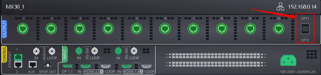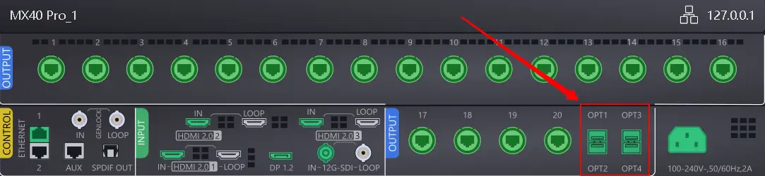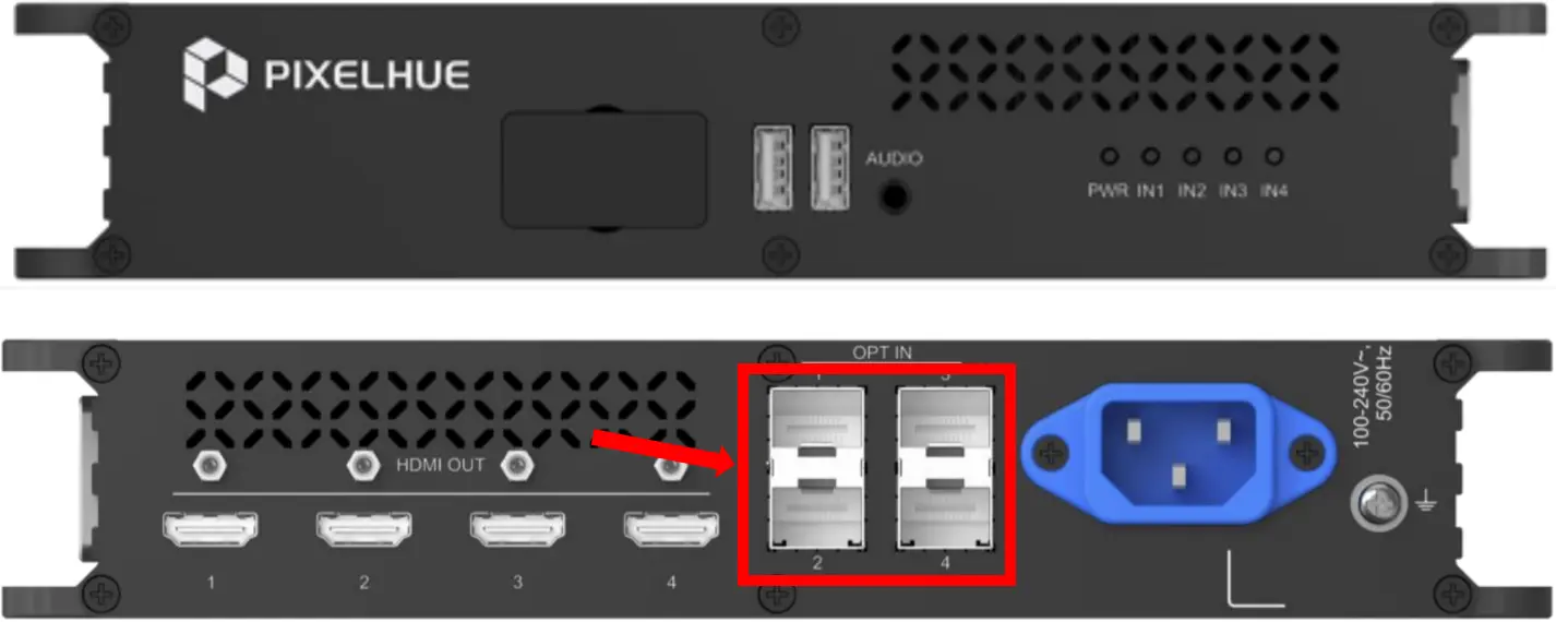Up to four 4k images can be output The two optical ports in each row are spliced left and right to form a 4k