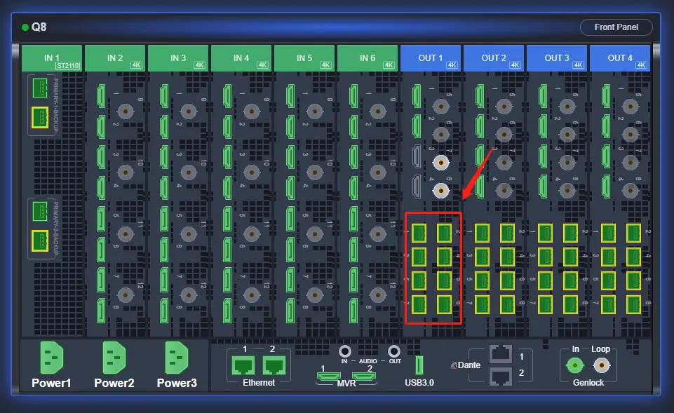 Switcher mode: supports up to 1*4k output or 4*SL outputs; PGM Only mode: supports up to 2*4k outputs or 8*SL outputs; 4k consists of the upper and lower optical ports spliced left and right