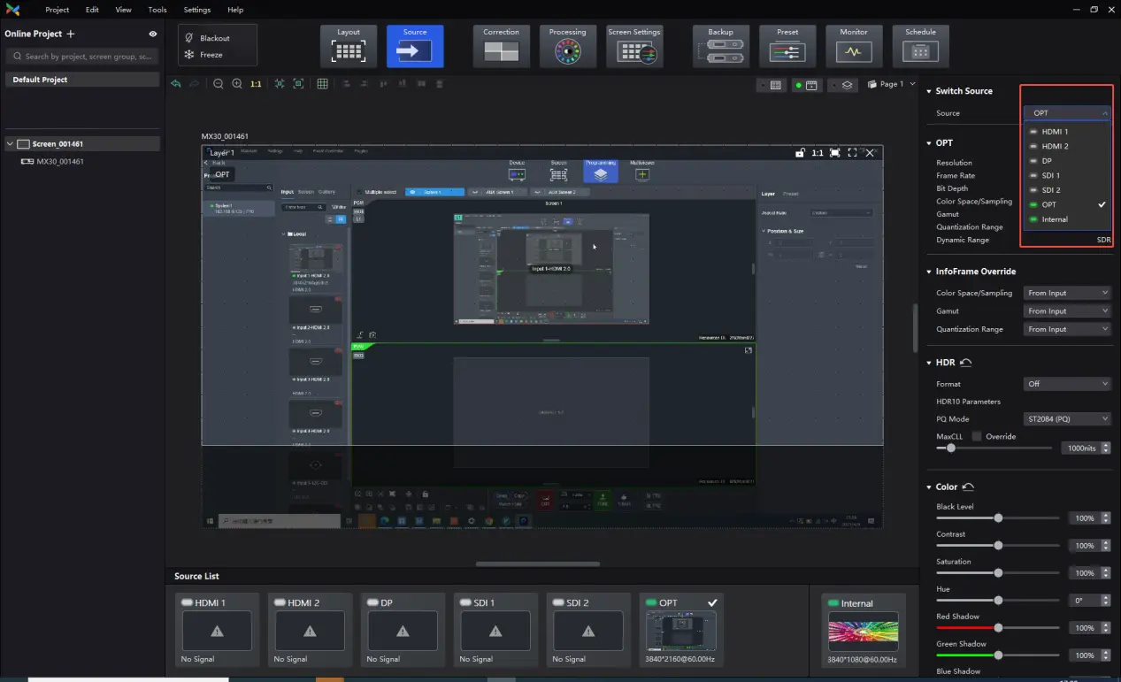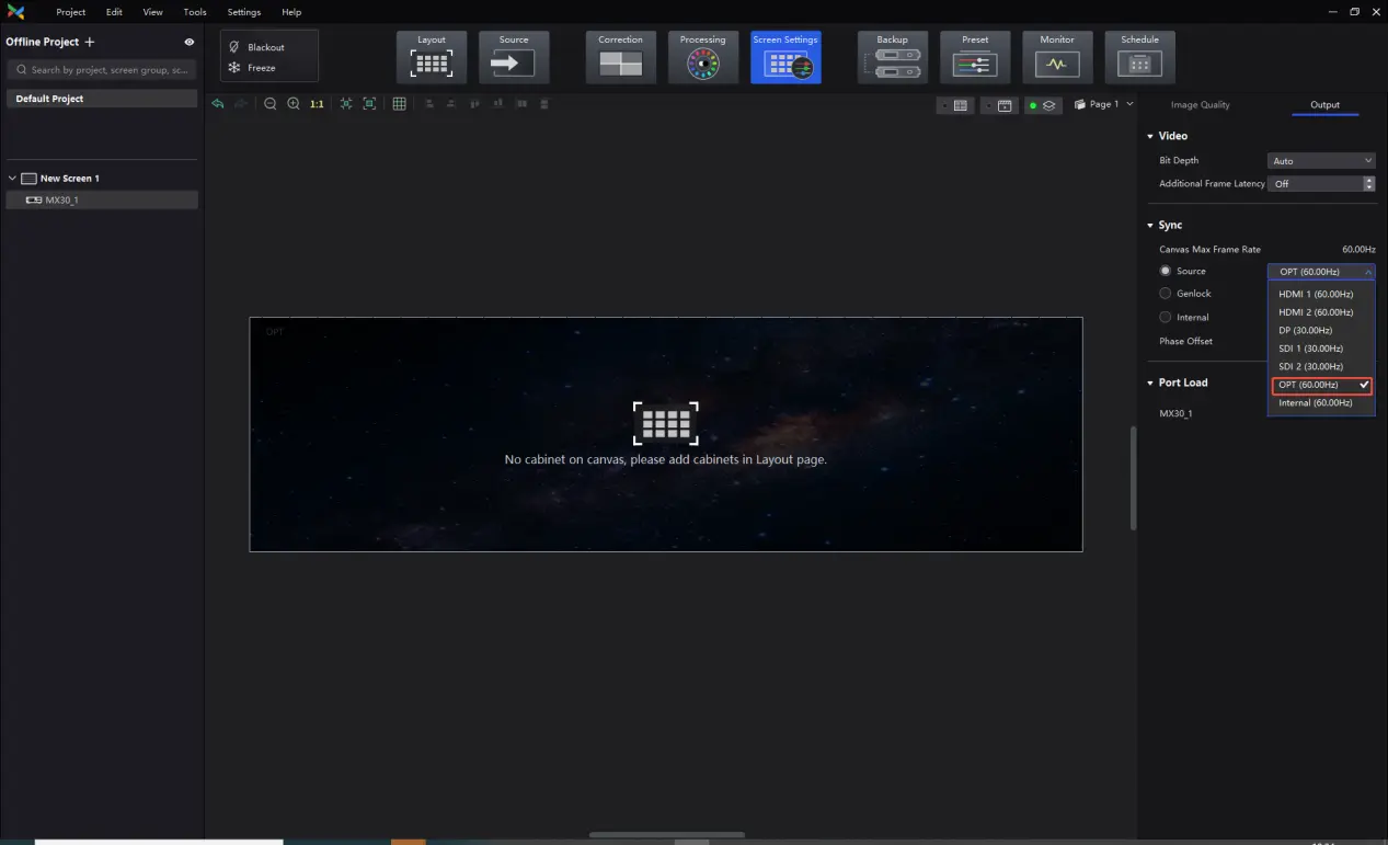 At Sync in properties area, select Source, then select OPT to Sync with the frame rate of the active source.
