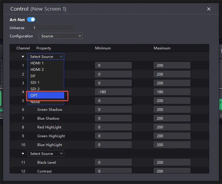 From the menu bar, choose Tools > Control, enable the Art-Net switch, and complete the OPT Source parameter configurations.