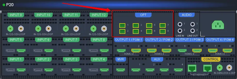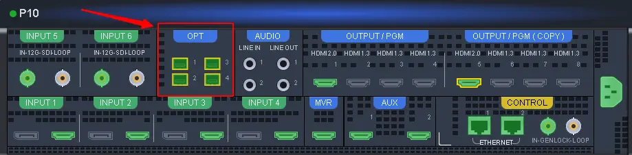 Switcher Mode: supports up to 2*4k output or 4*DL outputs PGM Only Mode: supports up to 4*4k output or 4*DL outputs 4k consists of the upper and lower optical ports spliced left and right