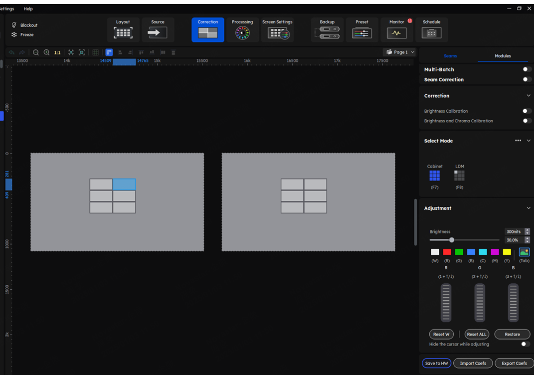 Click on "Correction" in the function tabs, and select "Modules" at the top of the function area to enter the multi-batch adjustment interface.