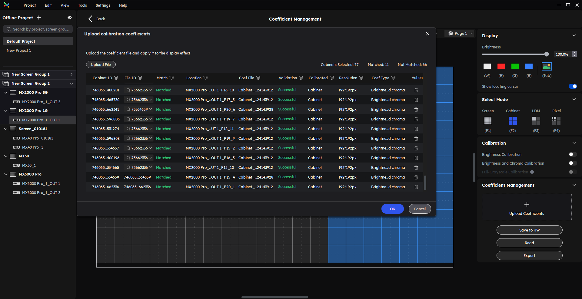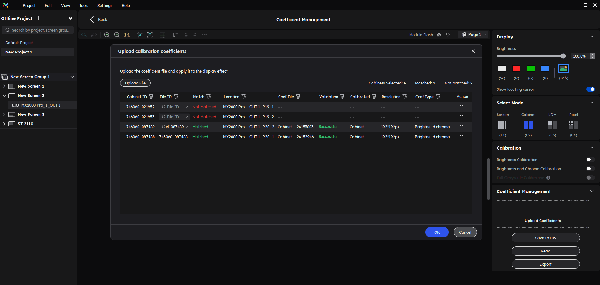After the user completes the batch upload of calibration coefficients, the software will automatically match the calibration coefficient IDs with the cabinet IDs. When a match cannot be made, the user also has the option to manually match the cabinets with the calibration coefficients.