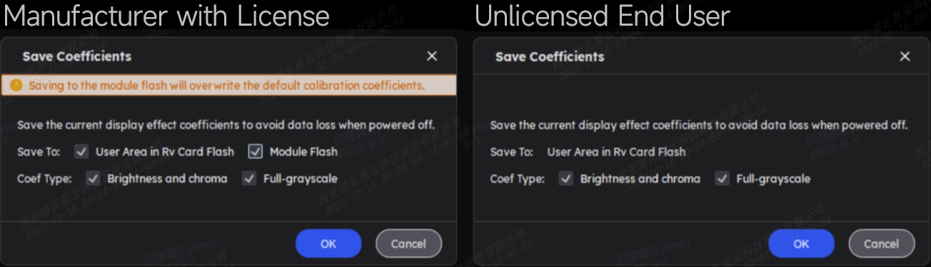 Save: Saves the current coefficient status of the VMP calibration coefficient management interface to the user area of the receiving card.
