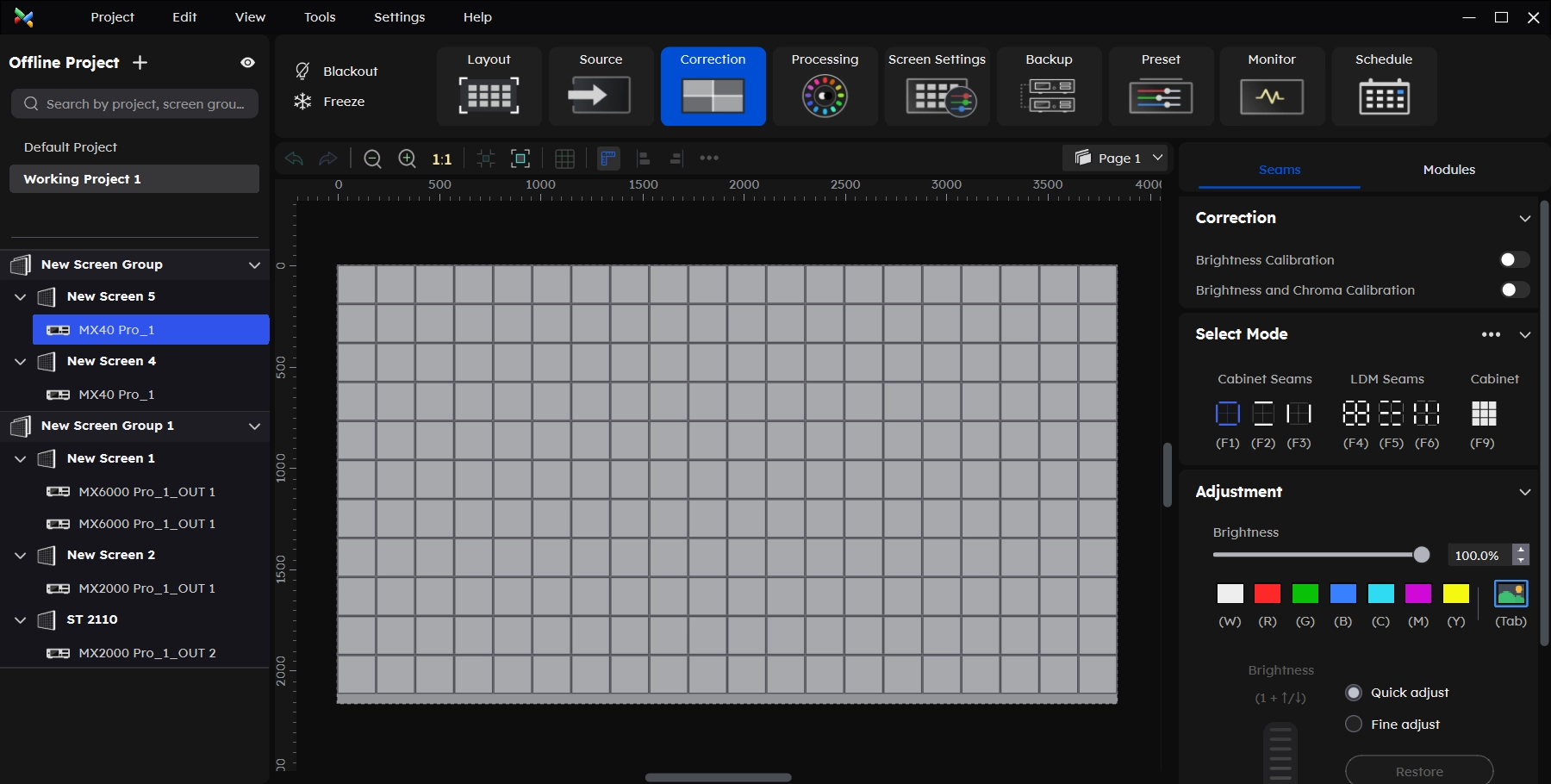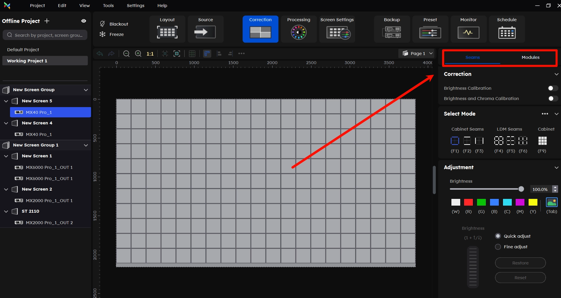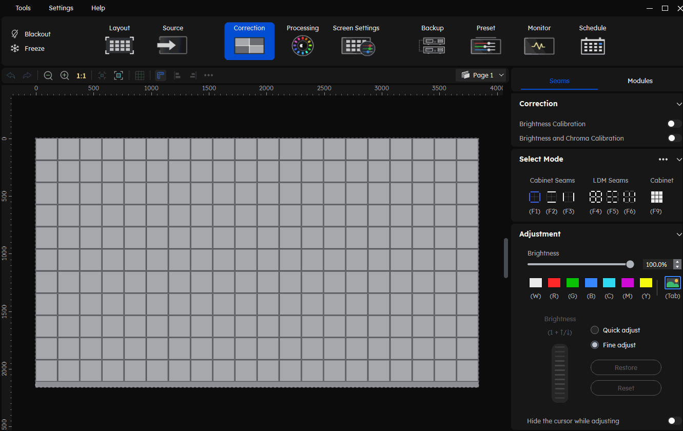 In the seam adjustment interface, when you use the mouse to select a module or cabinet seam, the VMP defaults to adjusting the brightness on both sides of the seam.