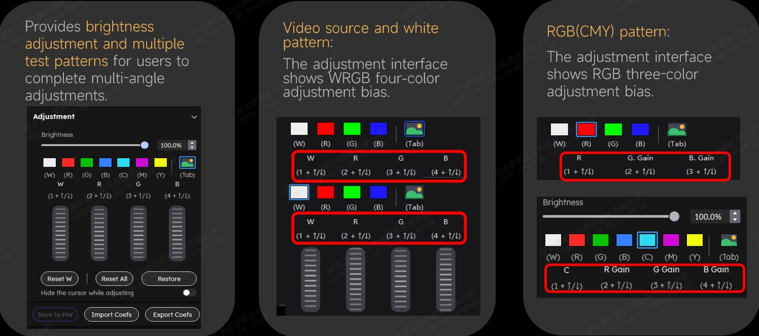 Provides brightness adjustment and multiple test patterns for users to complete multi-angle adjustments.
