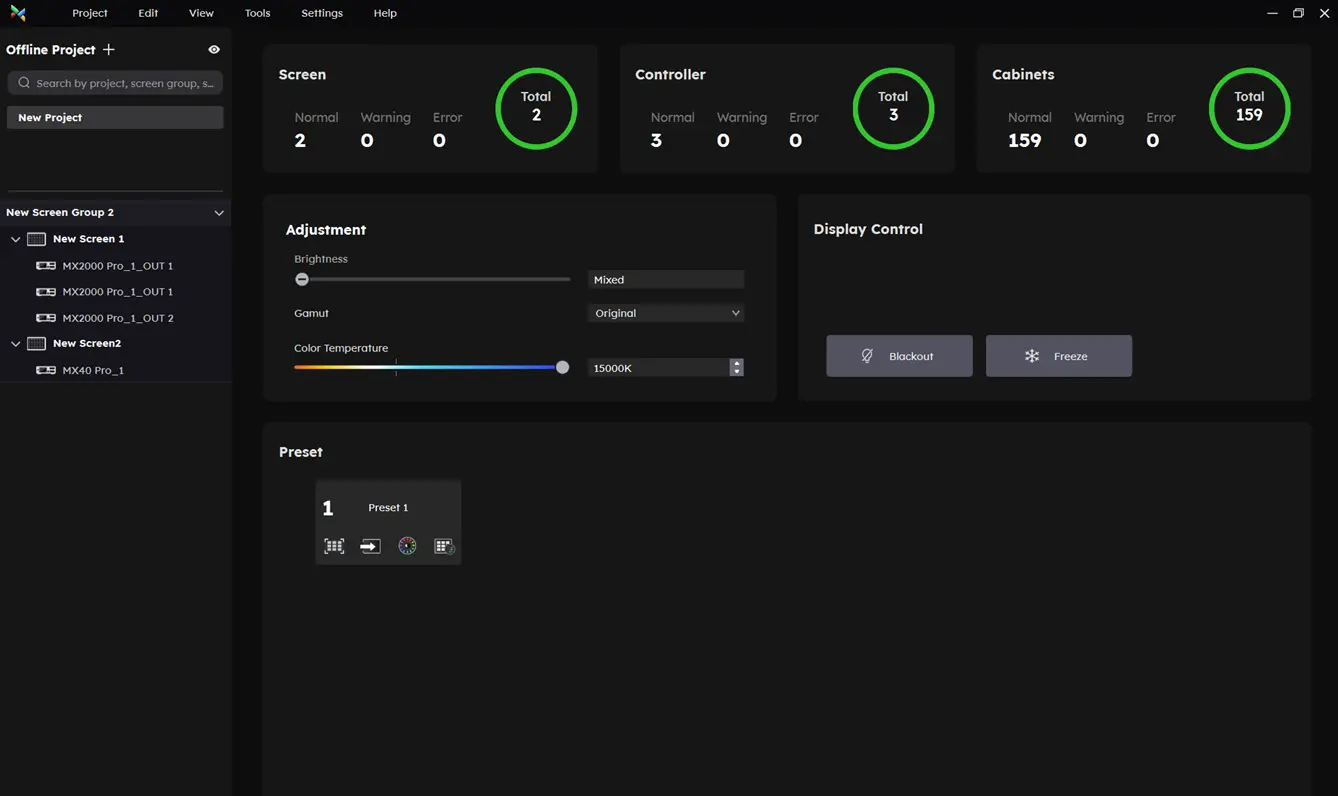 In version 1.5.0, in addition to the basic screen control available in previous versions, users can now view the basic information of screens, controllers, and cabinets through the screen group management interface and perform preset switching operations.