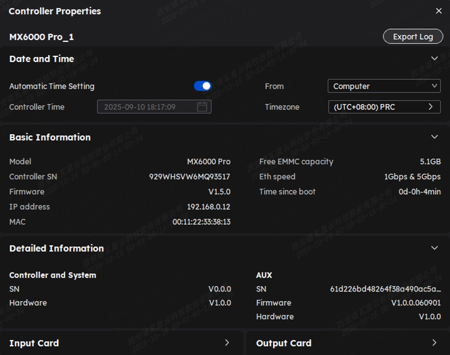 Check the input/output card name, model, SN, firmware version, hardware version and other information when connecting to card-based controllers (MX6000 Pro and MX2000 Pro).