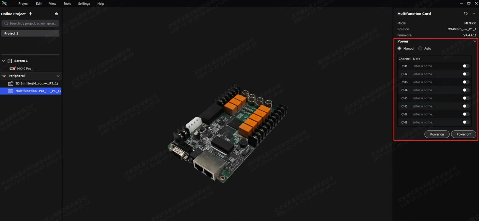 Select a multifunction card and set the power control mode in the properties area on the right. You can choose between the auto and manual mode. You can also click Power on or Power off to control the state of all power channels.